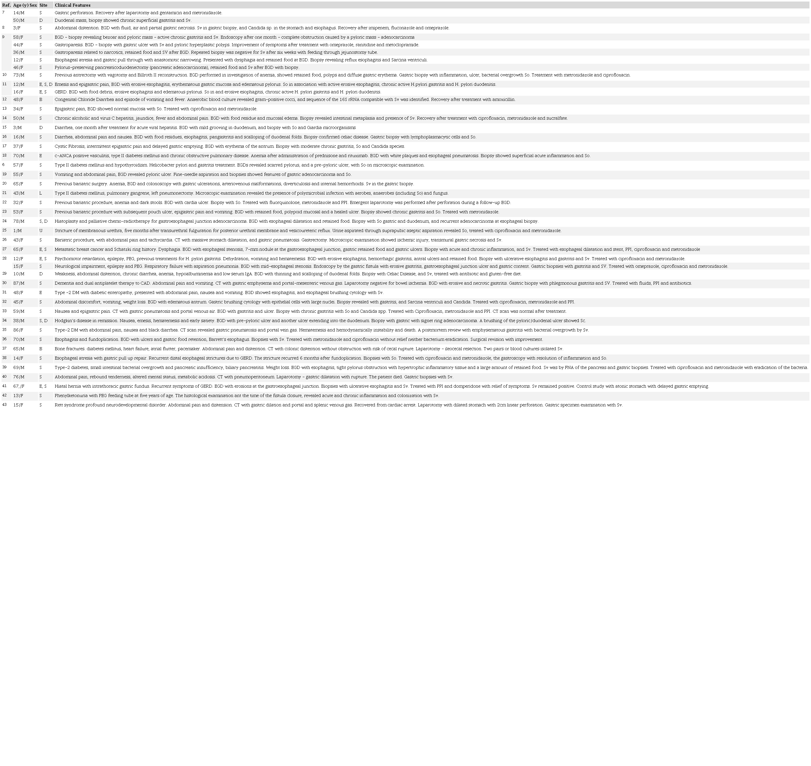 There are few case reports with this bacterium identification. Here, we report two cases with Sarcina ventriculi identification with distinct clinical settings. Two independent authors performed a review of the literature, through EMBASE and MEDLINE databases, using the following MeSH Terms: Sarcina ventriculi and Clostridium ventriculi. Additionally, the reference lists of the selected articles were individually examined to obtain other potentially relevant studies. Only articles in English were included. We identified thirty-seven articles, reporting forty-five cases until July 2020, with an increasing description since 2010 (Table 1). In most cases, the clinical conditions resulted in slower gastric emptying, such as previous surgery, obstruction or gastroparesis.