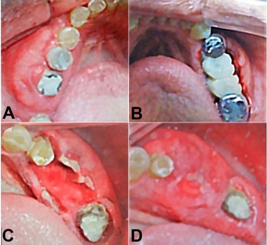 A 63-year-old male patient was referred to dental service, presenting bilateral, painful erythematous mandibular swellings affecting the posterior alveolar ridges, at the level of the premolars on the left side (Figure 1A) and molars on the right side. The lesion was subjacent to fixed dental prosthesis, which caused compression and bleeding of the augmented soft tissue (Figure 1B). After removal of the dental fixed prosthesis, the lesion showed a rapid increase in size in a week (Figure 1C, 1D).