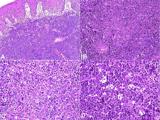 Incisional biopsies were performed in both sides under local anesthesia, and sent for histopathological study. However, after two days of the biopsy, the patient was hospitalized presenting malaise and breathing difficulties. By imaging studies, an abdominal tumor was detected, and patient died within 10 days. Microscopically, the oral lesions revealed a diffuse proliferation of monotonous, medium-sized lymphoid cells with scarce cytoplasm, round basophilic nuclei with fine chromatin, and multiple nucleoli. Nuclear pleomorphism, numerous mitotic and apoptotic figures were common (Figure 2A and B) including tingible body macrophages forming a “starry sky” pattern (Figure 2 C and D). The microscopical diagnosis of high-grade lymphoma was suggested. Immunohistochemistry and in situ hybridization (ISH) for EBV confirmed the diagnosis of SBL.