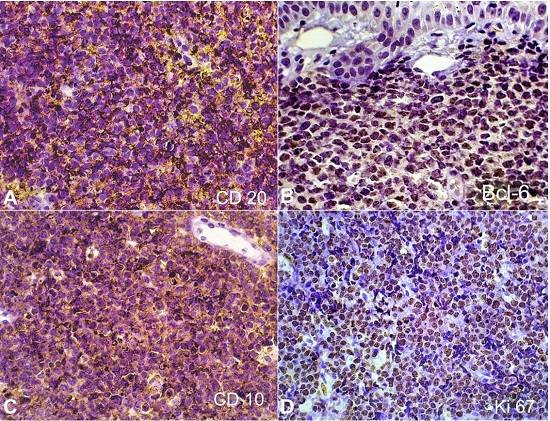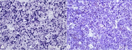 Immunohistochemically, only CD20 would coincide between our case and EBV+ DLBCL NOS, since the last have a non-germinal center phenotype, being positive for MUM-1 and commonly negative for CD10 and Bcl-6.1 Nevertheless, a study demonstrated one case of EBV+ DLBCL NOS expressing CD10, and two cases being Bcl-6-positive and MUM-1 negative.12