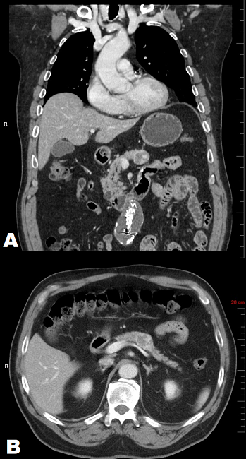Tumors with osteoclast-like giant cells have been documented within a variety of organs including the kidney, breast, thyroid gland, heart, parotid and skin.1,7-10 Within the pancreas, they are typically large, usually greater than 3.5 cm.3,7,9-12 The mean tumor size in reported cases was 5-8 cm.6,7,9-12 The tumor is usually a heterogeneous mass that can cause compression of adjacent normal structures, or constitutional symptoms such as fatigue and weight loss.3,7,9-12 Two-thirds of cases in the literature reported abdominal or back pain, one-third presented with painless jaundice.6,7,9-12 One third also reported nausea.6,7,9-12 Weight loss and anorexia were also reported in half of the cases.6,7,9-12 CA19-9 was elevated in two-thirds of cases described by Muraki et al.6 Our patient was asymptomatic and the tumor was discovered incidentally during evaluation of an abdominal aortic aneurysm.