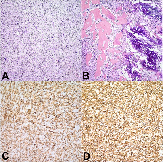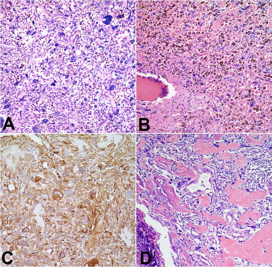On microscopic examination, the tumor was predominated by pleomorphic, spindle cells associated with hemorrhage and abundant hemosiderin pigment (Figures 2A and 2B). The spindle cell sarcomatous component was diffusely immunoreactive with vimentin (Figure 2C). Notably, the tumor contained several well-formed ductal structures (Figure 2D). With immunohistochemical staining the glandular structures were reactive with CK AE1/AE3 and CK Cam5.2 (Figures 3A and 3B). Osteoclast-like giant cells were present individually and in clusters (Figure 3C), staining positive for CD68 (Figure 3D), and were admixed within a background of numerous foamy histiocytes (Figure 4A). Areas of irregular calcification as well as malignant osteoid were evident within the tumor (Figure 4B). The foamy macrophages throughout the tumor as well as the osteoclast-like giant cells were immunoreactive with CD68 and CD31. The malignant spindle cells were positive for CD34, while CD31 highlighted adjacent foamy macrophages and giant cells (Figures 4C and 4D). Several large vacuolated malignant cells were admixed with the numerous foamy macrophages that resembled lipoblasts. This morphology and immunohistochemistry staining pattern was consistent with undifferentiated carcinoma of the pancreas with osteoclast-like giant cells. No premalignant lesions, including pancreatic intraepithelial neoplasia, intraductal papillary mucinous neoplasms and mucinous cystic neoplasm were identified.