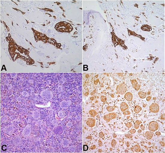 There is much debate in the literature as to the origin of the tumor, with many authors favoring mesenchymal origin, and others favoring epithelial origin.4,6,9-12 Consensus appears to be leaning toward an epithelial origin with some authors purporting that components of vimentin-positive carcinoma are mesenchymal transition from ductal cells.3,6 In reported cases, cytokeratin-positive ductal structures have been reported to comprise < 5% to 80% of the tumor.6 Our case was characterized by rare ductal structures and focal immunoreactivity with CK AE1/AE3 and Cam 5.2 (Figures 2B and 2C), and an atypical mesenchymal component with immunoreactivity with vimentin (Figure 3B). In a study by Luchini et al.,13 it was purported that UC-OGC’s are variants of pancreatic ductal carcinoma (PDC) due to the presence of shared mutations in KRAS and other critical tumor suppressor genes commonly associated with PDC (TP53, CDKN2A and SMAD4).