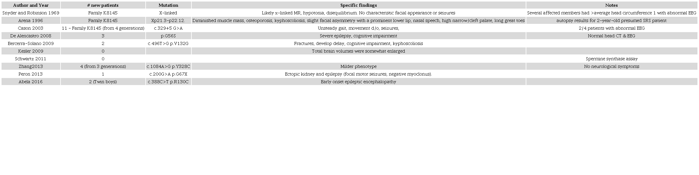 3 Albert J, Schwartz CE, Boerkoel CF, Stevenson RE. Snyder-Robinson syndrome. In: Adam MP, Ardinger HH, Pagon RA, et al., editors. GeneReviews® [Internet]. Seattle: University of Washington; 2013 [cited 2013 Jun 27]. p. 1993-2018. Available from: https://www.ncbi.nlm.nih.gov/books/NBK144284/