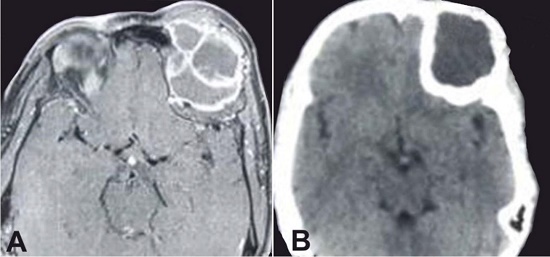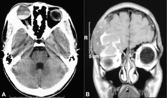 A 35-year-old female presented with left fronto-orbital swelling of 10 years’ duration. She had progressive deterioration of vision in the left eye for 1.5 years, and could barely perceive hand movements close to face. The proptosis increased over the last month. The left eye was displaced inferiorly and medially. No endocrine abnormalities were detected. Radiology revealed a lesion involving the orbital roof, the frontal bone, and the sphenoid wing (Figures 1A and 1B).
