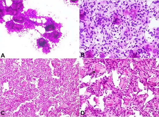 Abstract: Fibrous dysplasia (FD) is a relatively rare osseous disease of unknown etiology, wherein the normal bone is replaced by collagen-rich tissue, comprising of fibroblasts and variably abundant immature woven bone. Clinically, it may involve a single bone or multiple bones. It commonly arises in the jaw bone, skull, rib, and proximal femur. Those arising in the skull and the jaw are together termed “craniofacial fibrous dysplasia.” The differential diagnosis at this location includes meningioma and metastatic carcinoma. In this report, we highlight two diagnostically challenging cases presenting with orbital swelling and headache as the main complaints. Our first case was misinterpreted as meningioma on intraoperative squash smear, and paraffin sections revealed characteristic features of FD. The second case highlights the morphological feature of non-specific cystic degeneration occurring in FD. Radiographs in such cases show cystic swelling, which is indicative of a secondary aneurysmal bone cyst.