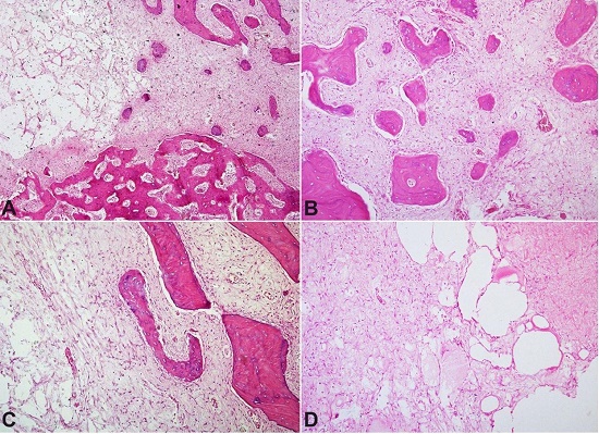 Sections examined from the excised part of the frontal bone showed a normal cortical bone at the periphery, while a lesional tissue was identified in the center (Figure 4A). This center lesion revealed numerous irregular-shaped trabeculae of immature woven bone without osteoblastic rimming (Figures 4B and 4C). Large areas of cystic degeneration were also identified (Figure 4D).
