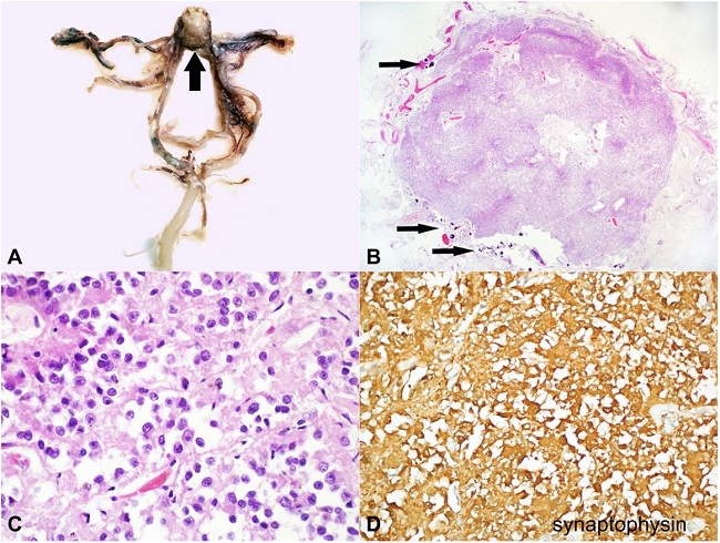 Histological examination of this lesion showed a nodular proliferation of small, uniform round cells, sometimes with cleared cytoplasm (oligodendroglioma-like appearance), in the absence of mitosis, endothelial proliferation and/or necrosis (Figures 1B, 1C), expressing a neuronal-like immunohistochemical profile: widespread immunohistochemical positivity for S100, Synaptophysin (Figure 1D) and Neuron-specific Enolase (NSE) were detected; the proliferation index, assessed by Ki67, was less than 1%. Immunohistochemical staining was negative for: cytokeratins AE1/AE3; EMA; GFAP; OLIG2; Chromogranin; GH; Prolactin; ACTH; TSH; LH; FSH; TTF1; CD31 and CD34.