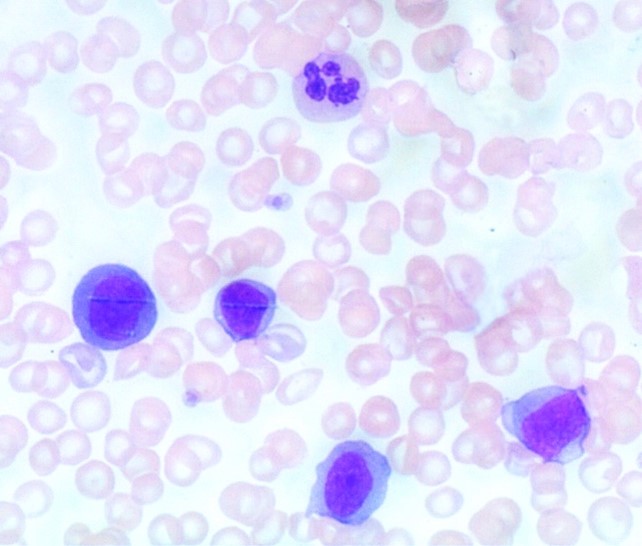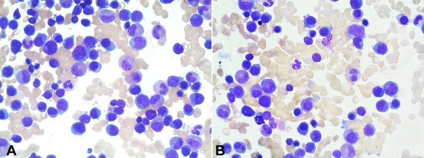 The peripheral blood smear showed 37% immature mononuclear cells with a moderate amount of dark blue cytoplasm; some were blasts (Figure 1).