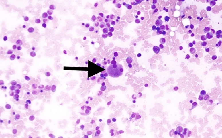 An asymptomatic female in her seventieth decade of life was referred to the hematologist because of pancytopenia, which was incidentally detected. Her medical history is remarkable for hyperlipidemia, essential hypertension, and atopic dermatitis. The patient does not drink alcohol. She was never submitted to chemotherapy or radiotherapy before. Her blood workup showed the hemoglobin of 7.8 g/dL (RR= 12.0 - 15.0 g/dL), white blood cells count of 4 K/uL (RR= 4.5 - 11.5 K/uL), platelets count of 109 K/uL (RR= 150 - 400 K/uL), elevated serum immunoglobulin-G level of 2,564 mg/dL (RR= 768 - 1,632 mg/dL), decreased serum Kappa/Lambda free light chain ratio of 0.22 (RR= 0.26 - 1.65), and mildly elevated serum creatinine of 1.15 mg/dL (RR= 0.50 - 1.10 mg/dL). Serum protein electrophoresis was remarkable for lambda-restricted monoclonal protein (IgG) of 1.8 g/dL. Urine protein electrophoresis, serum calcium, vitamin-B12, thyroid, hepatic function tests, and iron profiles were normal. No lytic lesions were identified on the skeletal survey.