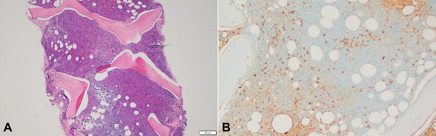 In addition, the bone marrow aspirate smear showed increased plasma cells (8% on manual differential count) (Figures 2A and 2B). Bone marrow core biopsy was hypercellular (70% of cellularity) (Figure 4A) with increased lambda-restricted plasma cells (about 10% of cellularity) (Figure 4B; immunohistochemistry for lambda). Bone marrow flow-cytometry was also remarkable for 3% lambda restricted plasma cells. Molecular studies show the following alterations: 2-FLT3 L601_K602insNFREYEYDL and ASXL1 E635fs*15. Chromosome analysis revealed a normal karyotype with no acquired clonal abnormality. The diagnosis of MDS-EB2, highly suspicious for AML and concurrent plasma cell neoplasm (clinically classified as smoldering myeloma) was made.