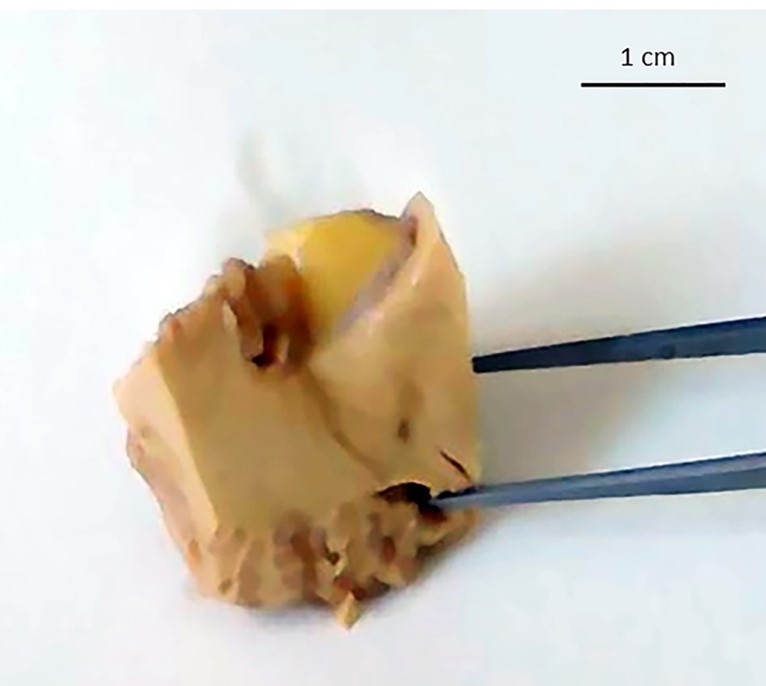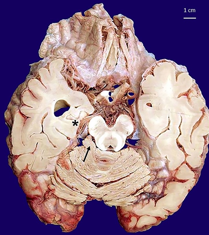 A 26-year-old girl was found dead in her home. Her family members reported they had seen her alive a few hours before and that she occasionally suffered from migraine, which was never medically investigated and treated with over-the-counter analgesics. They declined alcohol or drug abuse. The autopsy was ordered by the Judicial Authority. At post-mortem examination, the corpse was in good preservation conditions (weight = 52 kg, length = 171 cm). It did not present any sign of traumatic-blunt lesion on external examination. At cadaveric dissection, the brain showed smoothed convolutions and shallower grooves than normally and there was evidence of supratentorial herniation (uncal right) with tonsillar imprint (Figure 1). In the right cerebellopontine subarachnoid area, there was an unencapsulated neoformation in 0.8 cm in diameter with a well-delimited surface of yellowish color and elastic consistency (Figure 2). Nothing else significant emerged from the autopsy examination.