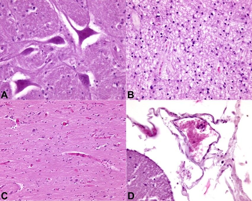 No evidence of malignancy was observed. Areas of acute neuronal hypoxic distress in the bulbar site (olive) and diffuse cerebral edema of a severe degree, mainly in the right hemisphere, were also documented (Figure 4).