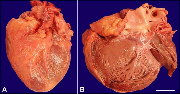 There was cardiomegaly (730-gram heart) with an increased amount of epicardial fat. The coronary artery system displayed patent ostia and a left dominant distribution. The coronary arteries were widely patent. The left and right ventricles were hypertrophied and dilated (Figure 1). No pallor, softening, hemorrhage or fibrosis were identified.