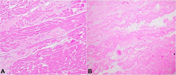 Microscopically, the cardiomyocytes were hypertrophied with enlarged nuclei and abundant eosinophilic cytoplasm. There was interstitial fibrosis and mild fatty infiltration in the papillary muscles and atria (Figure 2).