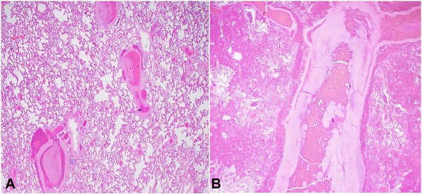 The weight of the lungs was significantly increased (1100 grams left, 1200 grams right). The cut surfaces of the parenchyma exuded a moderate amount of sanguineous fluid. Examination of the vasculature revealed diffuse scattered thrombi/emboli in segmental and subsegmental muscular pulmonary arteries. These findings were also identified in the microscopic examination (Figure 4).