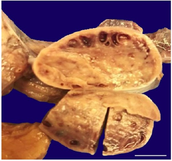 The ovaries were not enlarged (each 3.5 × 2 × 1 cm), but the parenchyma of both ovaries exhibited multiple cystic lesions in the cortical areas (Figure 5).