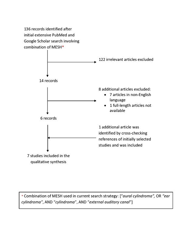 An extensive search of two medical databases (PubMed and Google Scholar) was performed by the Preferred Reporting Items for Systematic Reviews and Meta-Analyses (PRISMA) (Figure 1) standards in December 2022. The databases were searched for full-length articles and abstracts published in the English language and confined to human subjects, using the following Medical Subject Headings (MeSH): “aural cylindroma”, OR “ear cylindroma”, AND “cylindroma”, AND “external auditory canal”. Tumors in the “external auditory canal with or without pinna extension” were included. Both benign and malignant tumors were included. No age, race or demographic filters were applied. Only the articles published in English literature and confined to humans were included. Information from the included articles was collected in a pre-designed Microsoft Excel (Microsoft Corporation, USA) spreadsheet. No ethical approval was obtained as it was not required for this study.
