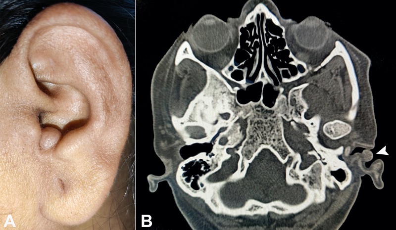 A 48-year-old female presented with a painless nodule over the cavum concha of the left ear for one year. The lesion was 10 x 8 mm, firm, non-tender, and gradually progressed to the present size (Figure 2A). She had no other aural complaints. She was otherwise healthy and did not report a history of alcohol consumption or smoking. No genetic or syndromic abnormalities were reported from her family.