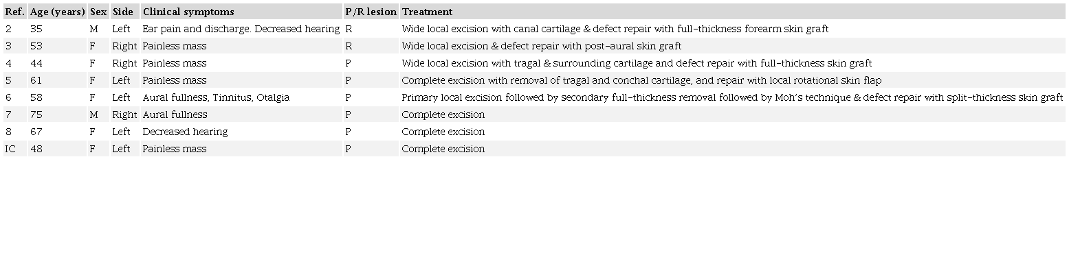 Surgical excision was employed in all the cases. In three cases, wide local excision with additional removal of surrounding EAC/pinna cartilage was utilized.2,4,5 Primary defect closure was done in 3 lesions, while defect closure with local/distant skin graft or flap was utilized in the remaining five cases.