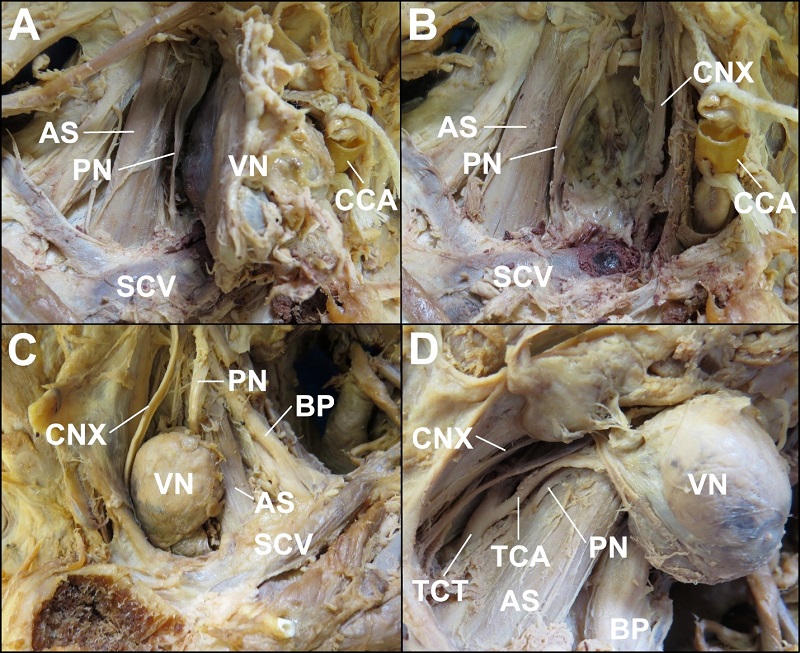 From a non-metric perspective, regional anatomical relationships were similar side-to-side. Each Virchow node was located anterior to the phrenic nerve, transverse cervical artery (which was involved within the connective tissues surrounding the right Virchow node), and anterior scalene muscle and posterolateral to the vagus nerve (Figure 2). The thyrocervical trunk and common carotid arteries were medial to the Virchow node (Figure 2).