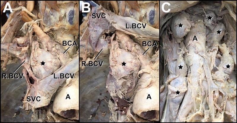 Hilar and mediastinal lymph nodes were enlarged and encroached upon local venous structures, including the superior vena cava and the brachiocephalic veins (Figure 4). Within the abdominal cavity, para-aortic “midline” adenopathy was also evident (Figure 4). All enlarged lymph nodes were similarly firm and rubber-like upon palpation; however, palpation was performed post-embalming and after hard fixation. Other gross findings included evidence of a total hysterectomy with bilateral salpingo-oophorectomy.