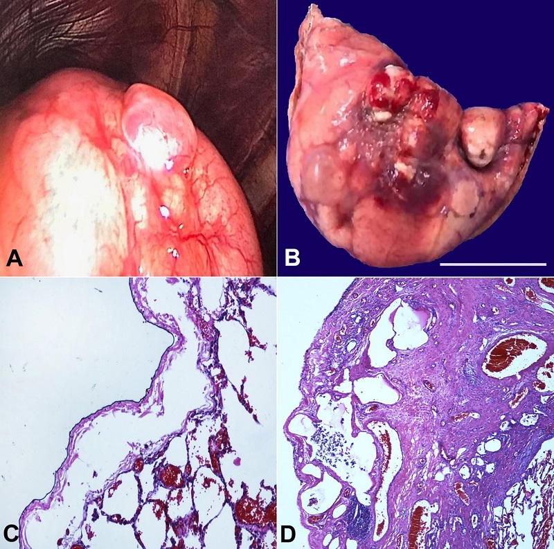 During the surgical approach using video-assisted thoracoscopy, we observed a sizable bulla surrounded by an area displaying increased vascularity and pleural retraction inferiorly, likely attributed to the prior rupture of another bulla or inflation (Figure 1A). The surgical specimen obtained from the apex of the left lung showed several bullae containing hematic contents, likely due to surgical manipulation, alongside areas consistent with previously ruptured bullae (Figure 1B). Microscopic analysis revealed areas demonstrating subpleural and intrapleural air accumulation, such as pleural interstitial emphysema (Figure 1C). Evidence of pleural porosity, characterized by intense fibrous thickening of the visceral pleura interspersed with air within the fibrotic regions, was observed (Figure 1D). The microscopic findings are significant as they correspond with the presumed mechanism involved in bleb formation.