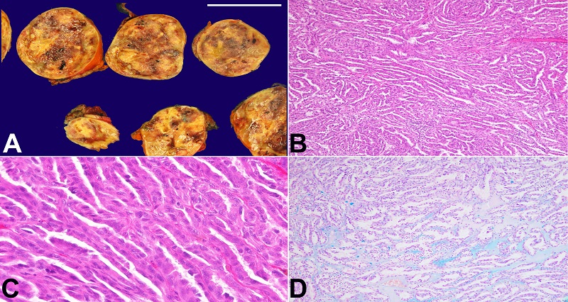 Papillary Renal Cell Carcinoma (PRCC), the 2nd most common RCC, accounts for 10-15% of cases and is usually composed of tubules and papillae with foamy histiocytes in papillary cores. Mucinous tubular and spindle cell carcinoma (MTSCC) is composed of tightly packed, elongated, curvilinear tubules with smooth luminal surfaces separated by mucinous stroma. MTSCC is associated with a more favorable prognosis than PRCC.1 PRCC and MTSCC have histologic and histochemical overlaps, including elongated tubules and stromal Alcian blue-positive mucin deposits.
