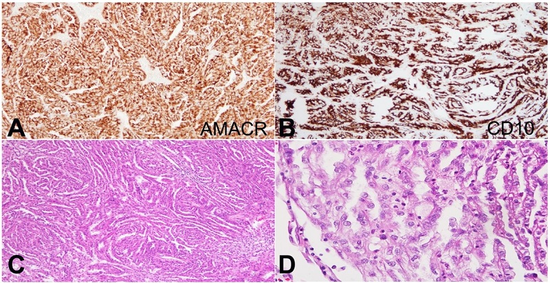 PAX8, AMACR, CK7, and CAM5.2 expression are found in both PRCC and MTSCC. Strong diffuse CD10 positivity and absent E-cadherin favor PRCC. Ren et al.1 immunohistochemistry analysis showed that the greatest difference was seen with CD10, as immunoreactivity was seen in 69% of PRCC cases and 30% of MTSCC cases. This demonstrates a limitation of the use of C10 for cases with indeterminate histologic features. CK7, AMACR, and PAX8 were positive in 100% of cases of both PRCC and MTSCC. CD15 was positive in 70% of PRCC and 60% of MTSCC, and EMA was positive in 80% of PRCC and 90% of MTSCC. YAP and TAZ are two downstream effectors of the Hippo pathway, which is thought to be disrupted in MTSCC. There no significant difference in YAP/TAZ expression between PRCC and PTSCC via immunohistochemical staining.1