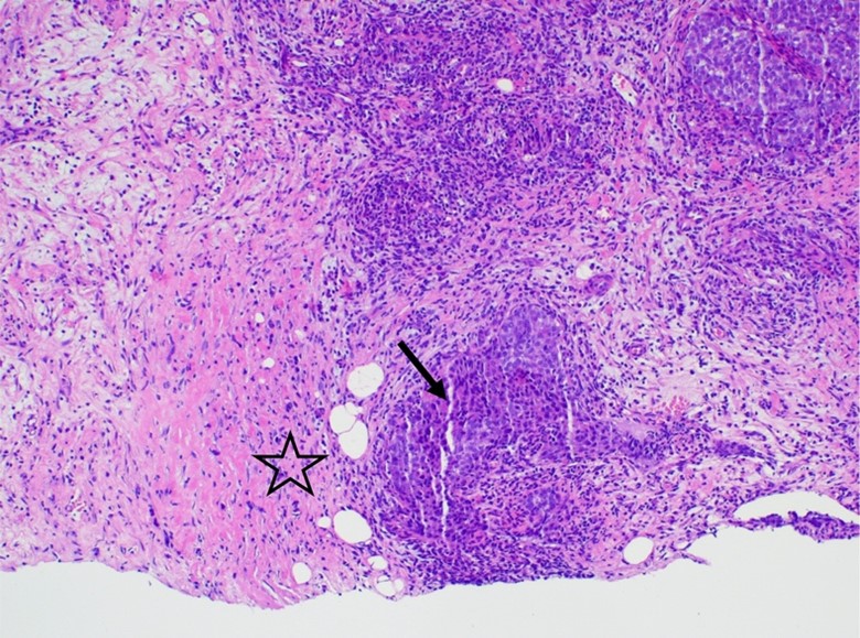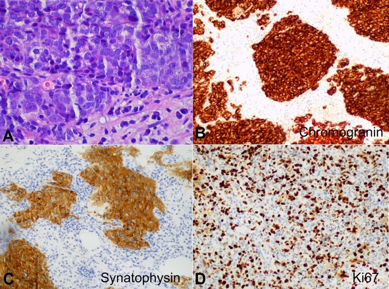 NEBC can spread to various sites, mostly to bones and the liver.2 Metastasis from another primary neuroendocrine tumor should always be excluded as a differential diagnosis using whole-body computed tomography (CT) or positron emission tomography (PET) scans. The latter should be a fluorodeoxyglucose-PET (FDG-PET) if the tumor is poorly differentiated and a gallium-PET if the tumor is well differentiated.
