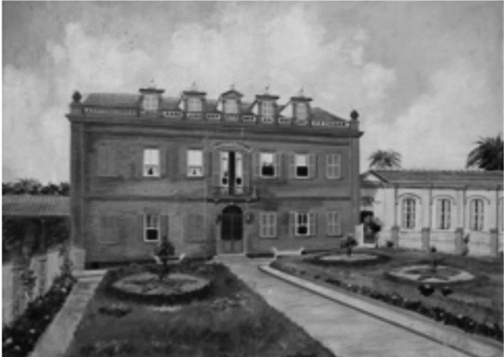 Pelo cruzamento da documentação escrita com as imagens da escola à época, deduz-se que o prédio destinado ao ensino de ciências foi construído junto ao prédio principal. Um afresco sem assinatura (pertencente ao acervo da escola)mostra que o prédio anexo ao edifício principal ainda mantém as características existentes antes de 1911 (Figura 1). O prédio à direita (no qual aparecem três janelas) existe até os dias de hoje e tem as dimensões de 15m x 6m e um pé direito muito alto. As janelas, de aproximadamente 2,5m de altura,são muito mais altas do que as do prédio principal, sugerindo que esse espaço foi construído provavelmente para práticas que necessitavam de ventilação, como as que envolviam aquecimento e produção de gases.