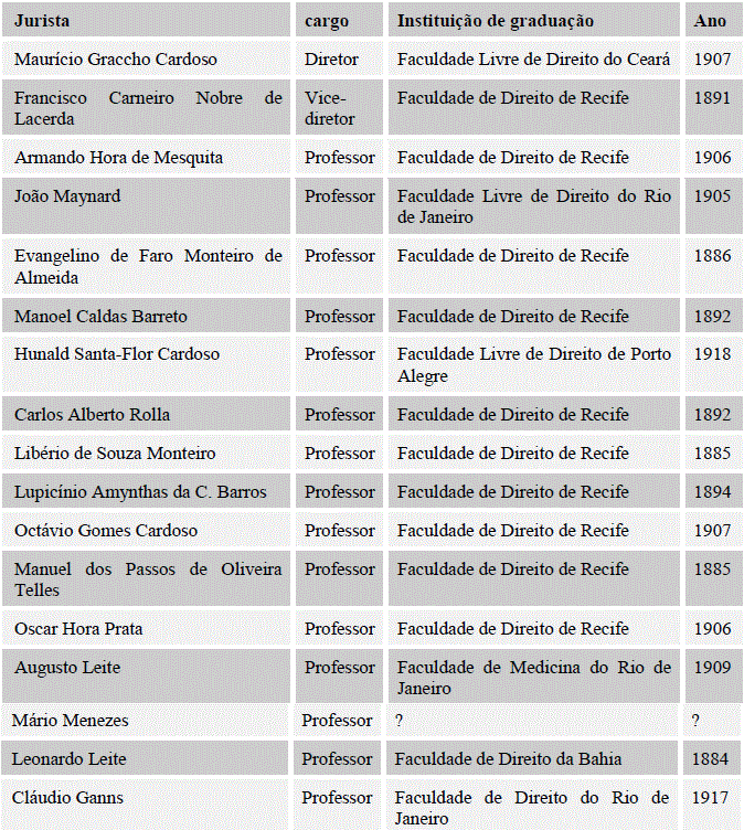 Não pôde até agora dar um passo adiante a tentativa da fundação, no Estado, de um instituto superior dessa natureza. Embora iniciada sob os mais promissores augúrios a constituição do respectivo patrimônio, de conformidade com a mais recente lei nacional do ensino, e apesar de contar o seu corpo docente com os mais seletos entre os que cultuam as letras jurídicas, não logrou, todavia, collimar o seu objetivo, por absoluto retraimento de alumnos à matrícula. Alludindo a essa circumstancia o dr. Francisco C. Nobre de Lacerda, seu director interino, não attribue a outra causa senão ao facto de estar aquella Faculdade equiparada aos estabelecimentos officiaes congêneres. A ser exacta a observação, o empenho feito nesse sentido não está longe de ser considerado um esforço positivamente infructífero (Cardoso, 1926, p. 12- 13).