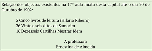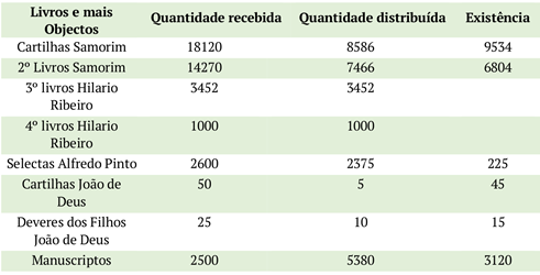 Trinta 1º livros de leitura por Hilário Ribeiro, vinte 2º livros de leitura por Hilário Ribeiro, doze 3º livros de leitura por Hilário Ribeiro, vinte manuscritos por Ventura, vinte doutrinas por Barbe, vinte e cinco aritméticas por Souza Lobo, quinze gramáticas por Bibiano, dezesseis gramáticas por Vasco de Araújo, vinte geografias por Vasco de Araújo, dez ditas da Província por Berlink (Andrade apud Arriada & Nogueira, 2014, p. 175).