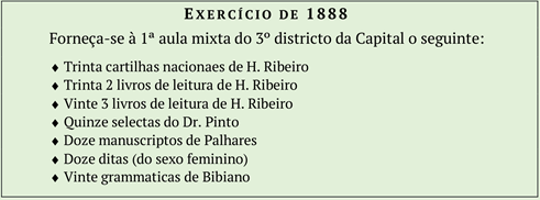 A Cartilha nacional e os demais livros de leitura de Hilário Ribeiro despontam na documentação do período que estudamos, ou seja, de 1873 a 1921. No quadro abaixo, consta uma das muitas listas de fornecimento de material às escolas que localizamos na pesquisa: