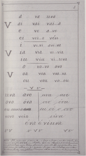Embora, de fato, nas lições propostas por João Simões Lopes Neto, estivesse a conjugação de palavras e frases (e, em uma parte final, a apresentação de textos), é preciso considerar que, do ponto de vista dos métodos de ensino da leitura e da escrita, a proposta da Artinha situava-se na confluência dos métodos sintético e analítico. A palavra, a sentença ou a frase não eram o mote para o ensino inicial da leitura e sim ‘as letras’, embora não de forma isolada. Na análise desse material, em confronto com outras produções didáticas da época, é preciso levar isso em conta. Dividida em quatro partes11, as três primeiras lições da Artinha (Parte I) apresentam as vogais e os ditongos, indicando assim que a ‘porta de entrada’ do método deveria ser as letras, mas não seus nomes e sim seus sons, aspecto no qual muito insiste o autor, especialmente nas notas do livro. Igualmente, do ponto de vista gráfico, a letra é o destaque na página de cada lição, como se pode ver no exemplo reproduzido abaixo, da primeira lição das consoantes (v):