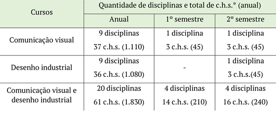 No Quadro 2 tem-se a síntese da integralização curricular dos cursos de comunicação visual e desenho industrial. Sendo que do montante de disciplinas que configura a estrutura dessas graduações da UFPR, constata-se que 2.280 horas são comuns às duas formações distribuídas em 20 disciplinas anuais e oito semestrais.