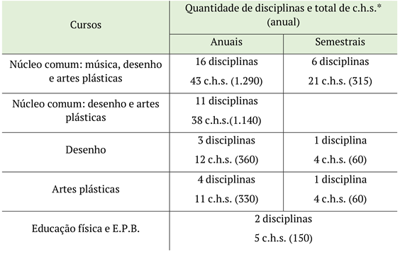 Os cursos de educação artística tinham um núcleo de disciplinas comum às três habilitações, conforme Quadro 3, na maioria estruturadas no primeiro e segundo ano da graduação. Dentre elas, 16disciplinas anuais que perfaziam 43 horas semanais (1440 horas anuais): HA401-Estética e História da Arte I (3h),HA405-Desenho Artístico I (3h), Formas de Expressão e Comunicação Artística I, II, III e IV (HA428, HA429, HA430 e HA431) com 3 horas semanais cada, HA436-Arte Popular no Brasil B (3h), HA439-História da Arte Brasileira B (2h), HA440-Expressão em Volume A (3h), HA441-Dança I (2h), HA460-Flauta Doce I (2h),HL423-Literatura Aplicada ao Ensino (3h);HL429-Semiótica e Comunicação A (2h),HC445-Fotografia A (3h),HC450-Cinema I (3h), HF402-Estética A (2h).E6disciplinas semestrais que totalizavam 21 horas semanais: EP001-Estrutura e Funcionamento do Ensino do 1º e 2º graus (4h), ET014-Psicologia da Educação IV (4h), EM001-Didática I (4h), EM032-Prática do Ensino de Educação Artística (4h), EB021-Orientação Bibliográfica (1h) e EM039-Metodologia do Ensino de Artes (4h).Ainda como núcleo comum às três habilitações, soma-se a carga horária de Educação Física (90 horas anuais) e Estudo de Problemas Brasileiros - E.P.B. (60 horas anuais).