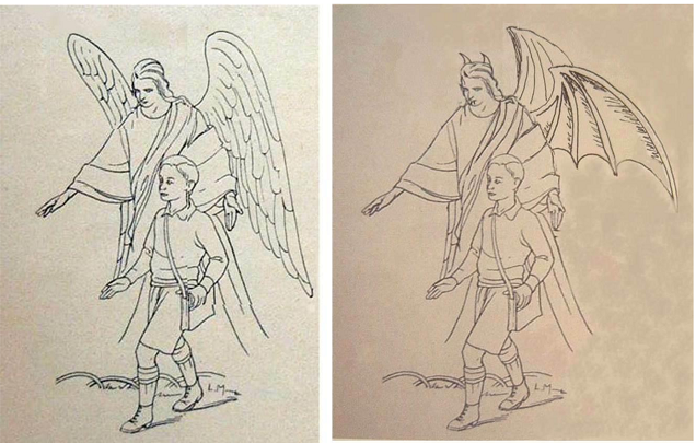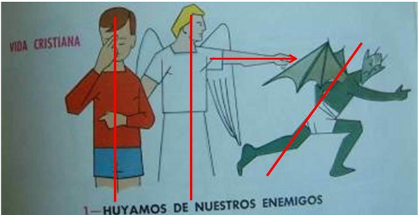 En la ilustración, elaborada con trazos firmes y sencillos, podemos identificar, en el nivel preiconográfico tres personajes absolutamente descontextualizados en cuanto a que no aparecen en ninguna escena -o escenario-. La falta de motivos, de detalles, no implica que la imagen pierda fuerza en su significado. Si entramos en el segundo nivel del método, es decir, en el nivel iconográfico propiamente dicho observamos que en su estructura y leída de izquierda a derecha está formada por dos personajes que forman dos líneas verticales que trasmiten estabilidad y firmeza. En la parte derecha otra línea, a priori, también vertical parece que se inclina, que cae, hacia el lado derecho. Es la única línea horizontal que cruza la imagen la que parece provocar este efecto: la mano del ángel contiene la fuerza para derrumbar al mal, al pecado, representado en el demonio. Si nos detenemos en los colores que contiene la ilustración, su análisis corrobora lo expuesto. El demonio aparece en verde, el color de la putrefacción y del moho. Como afirma Heller es el color del veneno, “[…] el demonio se representa en verde porque es el color más inhumano” (Heller, 2000, p.114). Este color relaciona al diablo con serpientes y lagartos y, por tanto, con el pecado original (Heller, 2000). La figura de la izquierda aparece en rojo, el color de la sangre y de la vida, un color caliente que tiende a acercar al espectador. La figura central, protagonista de la escena, aparece en color blanco, el color del bien y de la perfección, color de la pureza, de la paz, de la humildad (Núñez, 2014).