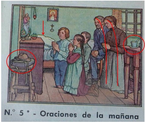 En el siguiente ejemplo (Figura 3), identificamos como elementos básicos y centrándonos en el primer nivel del método de análisis, la cartera preparada, la cama sin hacer, una taza, una mesa, cinco personajes, una virgen, un aparador. Todos estos detalles nos indican que lo primero que hay que hacer por la mañana es la oración, antes del desayuno, antes de comenzar las labores. El texto además corrobora lo que la imagen intenta trasmitir. Es significativo como los padres forman una línea curva que transmite protección durante este acto insistiendo en la importancia del momento.