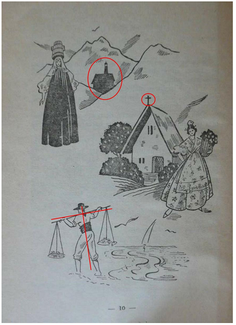 Mostramos ahora una imagen de un texto de 1963 cuyo autor es Agustín Serrano de Haro, Inspector general de Enseñanza Primaria7 durante el franquismo y autor de multitud de manuales escolares durante esa época8 (Figura 4). La imagen, sencilla en su composición y en sus motivos artísticos, está compuesta por tres ilustraciones diferentes que pretenden mostrar la diversidad de España, en paisajes, tradiciones, labores, etc. Sin embargo, en las tres imágenes aparece un símbolo común, la cruz que representa la catolicidad en todas las regiones del país. En las dos partes superiores aparecen sendas, imágenes de iglesias, mientras que la imagen inferior es el pescador con sus utensilios de pesca quien forma la cruz.