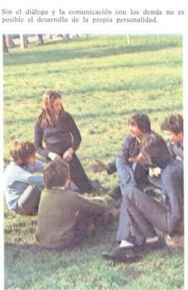 La imagen que analizamos a continuación está extraída de un manual de Ciencias Sociales de 1979, editado por Santillana10 (Figura 6). En ella aparecen seis personajes interactuando entre ellos que forman un círculo, círculo que da dinamismo a la imagen. Es significativo que el personaje que, por su situación en la fotografía, llama la atención sobre el resto pues es la única mujer que compone el grupo de personajes. El color que predomina es el verde, en este caso como representación de la naturaleza y aportando una perspectiva de lo que es cívico. Simboliza también la vida, la salud. El color azul, con el que visten los personajes, aumenta el efecto naturista del color predominante (Heller, 2000,p.107). El color azul, además, pese a ser frío y distante simboliza la armonía y la fidelidad. El texto que acompaña a la imagen “[…] sin el diálogo y la comunicación con los demás no es posible el desarrollo de la propia personalidad […]” demuestra que en este caso la imagen es utilizada para reforzar el contenido del texto.
