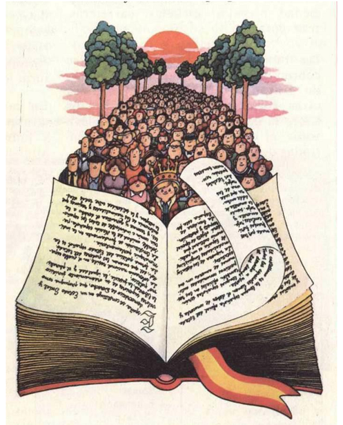 Analizamos ahora una ilustración de un manual de Ciencias Sociales editado en 1980 por la editorial Anaya11 destinado a alumnos de un curso avanzado de la Educación General Básica (Figura 7). En la imagen podemos ver cuatro elementos fundamentales: en primer lugar, observamos un libro con su correspondiente marcapáginas; en segundo lugar, observamos un conjunto de personas, mujeres y hombres, todos ellos en la misma posición; en tercer lugar, aparecen dos arboladas una enfrente de otra; y, por último, el sol y las nubes en tonalidades rojas. En un análisis iconográfico debemos prestar atención a la imagen principal, el libro de color blanco, color también de la univocidad y de la exactitud (Heller, 2000). Varios símbolos nos hacen pensar que el libro representa la Constitución: en primer lugar, el marcapáginas que representa la bandera de un país; en segundo lugar, el primer personaje que aparece entre la multitud porta una corona, símbolo de la monarquía. Es, además, el único personaje que está en contacto con el libro, iconológicamente podemos interpretar que este personaje, que simboliza a la monarquía, se apoya en la representación de la Constitución. Son estos elementos (la constitución y el rey) los que dan orden a lo que viene detrás, la multitud, el pueblo que, aunque aparentemente parecen aglutinados, por su composición trasmiten orden y organización. La línea de árboles verdes simboliza la civilización, ayuda a organizar a la multitud que está vigilada por el sol como símbolo de la divinidad, de la luz, el sol asoma como el orientador de los ciudadanos representados, como el ‘Padre Universal’.