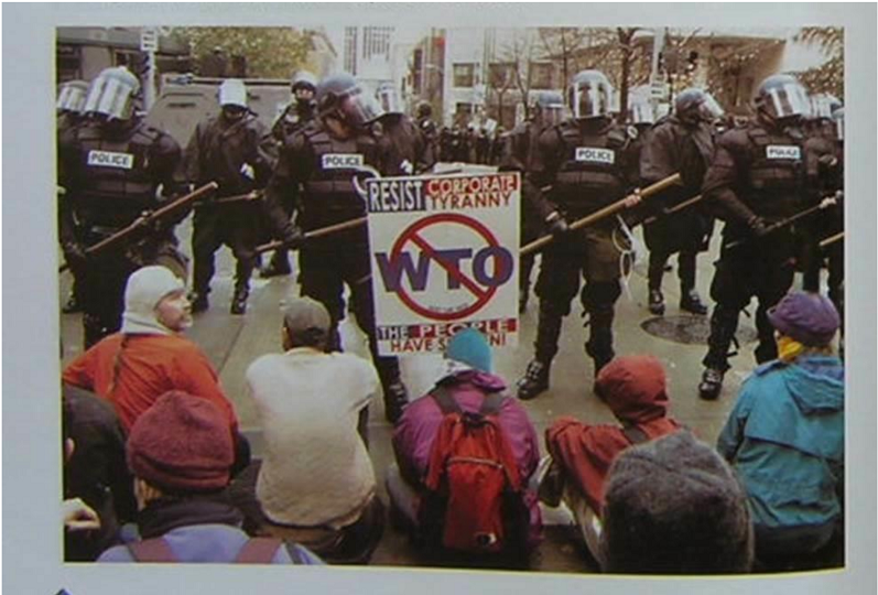 La imagen está divida en dos partes. Ambas partes forman dos líneas horizontales paralelas: en la línea alta es representado el poder, mientras que en la parte baja aparecen los sometidos. Los palos que portan los protagonistas de la parte superior parecen amenazar a los personajes de la franja inferior formando una barrera difícil de flanquear. Los protagonistas de la parte de arriba visten de negro, color utilizado para representar el poder, la muerte, la violencia, el misterio. En la franja inferior predomina el rojo, color utilizado tradicionalmente para representar atracción, fuerza, vida, valentía y vigor.