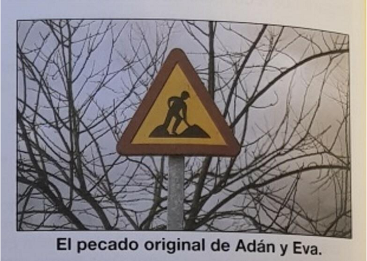 Preiconográficamente podemos enumerar elementos como: ramas secas, un triángulo, un distintivo o símbolo dentro del triángulo, una barra de metal. En un análisis iconográfico reconocemos el triángulo como una señal de tráfico internacionalmente reconocida que significa ‘peligro obras’. Esta señal de peligro va escoltada por un árbol aparentemente seco, que simboliza la naturaleza muerta. Iconológicamente la fotografía representa las consecuencias más importantes del pecado original que cometieron Adán y Eva: por una parte, el debilitamiento de la naturaleza humana, la pérdida de los dones preternaturales de la inmortalidad y la exención del sufrimiento que ha quedado sometida a la ignorancia y a la muerte, y por otra, la imposición del trabajo para el hombre y todos sus descendientes. En el Génesis leemos el siguiente párrafo: