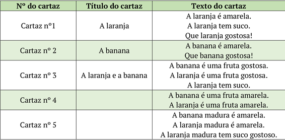 No começo, assim, eles ainda não podiam escrever, eu fui fazendo a escrita devagar. E aí eu pegava aquela história e punha num cartaz assim, escrevia mesmo num cartaz, daí o nome de ‘cartaz de experiência’, porque eles tinham tido a experiência. O cartaz ficava ali muitos dias, no outro dia eles liam no cartaz, daí já era uma leitura no papel, eles liam. Depois desse cartaz da laranja, que ali ficava vários dias, eu dava a banana. Por quê? Porque a banana também é amarela, a banana também é uma fruta, a banana também é gostosa.Então eu tinha algumas palavras que se repetiam, então eu reutilizava, e fazia a mesma coisa, ‘eles pensavam que eram eles que tinham elaborado’, e isso que era o interessante, na verdade eles ajudaram a elaborar (Bittencourt, 2017, grifo nosso).
