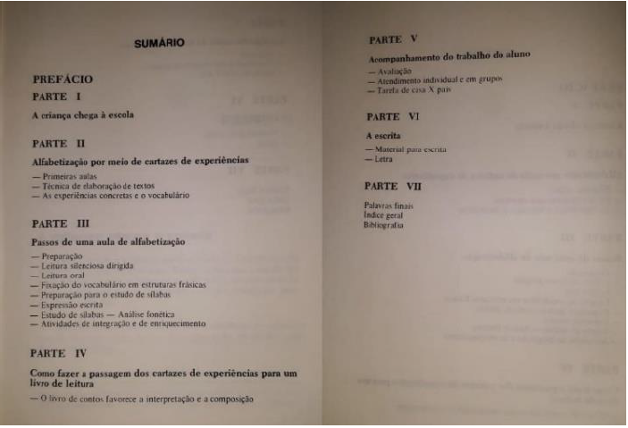 Na primeira parte, contendo quatro páginas, há uma descrição minuciosa dos procedimentos a serem realizados no período de adaptação da criança na escola. A segunda parte é dedicada aos Cartazes de Experiência, uma sequência de lições-base para a alfabetização. Segundo a autora, é a parte principal do livro, considerando estarem ali todas as lições a serem feitas pelas crianças, é o método de alfabetização. As demais são referentes a procedimentos didáticos para as aulas, com descrições passo a passo a serem seguidas e também uma parte dedicada às avaliações das crianças.