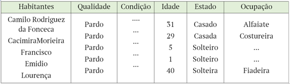 Lourença e seus filhos eram agregados nesse domicílio porque lá os encontramos assinalados como pessoas de condição livre sem qualquer indicativo que houvesse parentesco com o casal que chefiava a moradia.