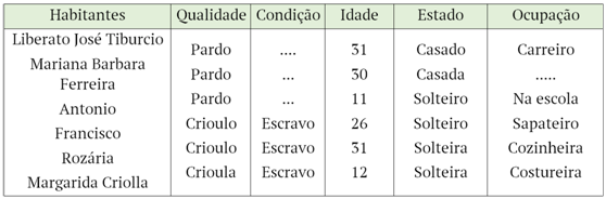 ‘D. Mariana’ aparece aqui com um nome relativamente distinto daquele com o qual apareceu no registro de batismo, ou seja, sem o ‘de Santa’ (Quadro 2). Foi assinalada como uma mulher parda, livre, reconhecida em situação de matrimônio legítimo com Liberato José Tiburcio, também pardo. Com ele, teve um filho que se chamava Antônio que tinha 11 anos de idade que frequentava a escola de primeiras letras. A legitimidade do casamento e a frequência do filho à escola eram elementos que indicavam o status dessa família negra. A isso podemos acrescentar ainda a posse de três escravos que também aparecem no domicílio. Portanto, não resta dúvida quanto ao fato de que ‘D. Mariana’ ocupava um lugar social que lhe conferia prestígio.