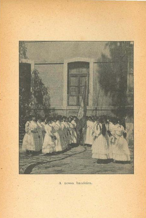 Do ponto de vista material, o livro é fartamente ilustrado por fotografias, nas quais se observam elementos constituintes da cultura escolar daquele tempo, além de paisagens, efemérides, e monumentos comemorativos, os quais facultavam o tom acertado para a obra13. Uma fotografia composta predominantemente por meninas uniformizadas em roupa de festa e perfiladas ao lado da bandeira nacional precedia o primeiro texto: A nossa bandeira. No fundo, há o destaque para a arquitetura do prédio que nos remete aos grandes edifícios escolares, sobretudo pelas dimensões avantajadas da parede frontal, da porta e das janelas, conforme a figura 1 apresentada abaixo.