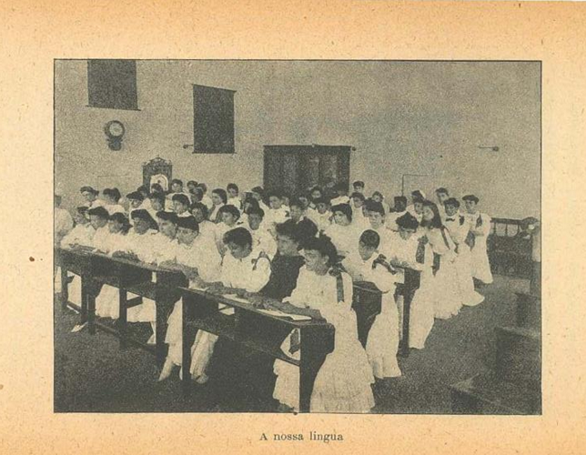 O livro registraria outra composição com teor semelhante: A nossa língua, tendo como pano de fundo, por um lado, a escola; por outro, mestres e alunos. O exercício de composição, dessa vez, era precedido da fotografia de uma classe mista, com alunos uniformizados, com sala ampla, mobiliada com mesas escolares geminadas, com um relógio na parede, com um armário e mapas. Esse era o cenário ideal montado para que um personagem representado como velho, mestre do mestre, discorresse sobre os valores da língua materna. No enunciado descrevia-se a língua como o elemento de maior caracterização da pátria. Deveria, a bem da verdade, ser melhor conhecida por todos que a utilizam, visto constituir, segundo aquele ideário, a subjetividade, a identidade e a tradição do povo brasileiro. Sublinhavam-se, por outro ângulo, as dimensões da raça e da nacionalidade de um povo veiculadas pela língua. Em síntese, importava ressaltar no livro escolar de leitura Historias da nossa terra que língua e pátria consistissem em noções equivalentes. E não somente por essas razões o povo brasileiro deveria sentir extremo orgulho pela língua nacional. Haveria, acima de tudo, a perfeição - traço singular que nenhuma outra língua traria. “De sonoridade variadíssima, opulenta nos seus vocábulos, maleável como cera ou dura como diamante, a língua portuguesa é a mais bela expressão da inteligência humana” (Almeida, 1911, p. 13).